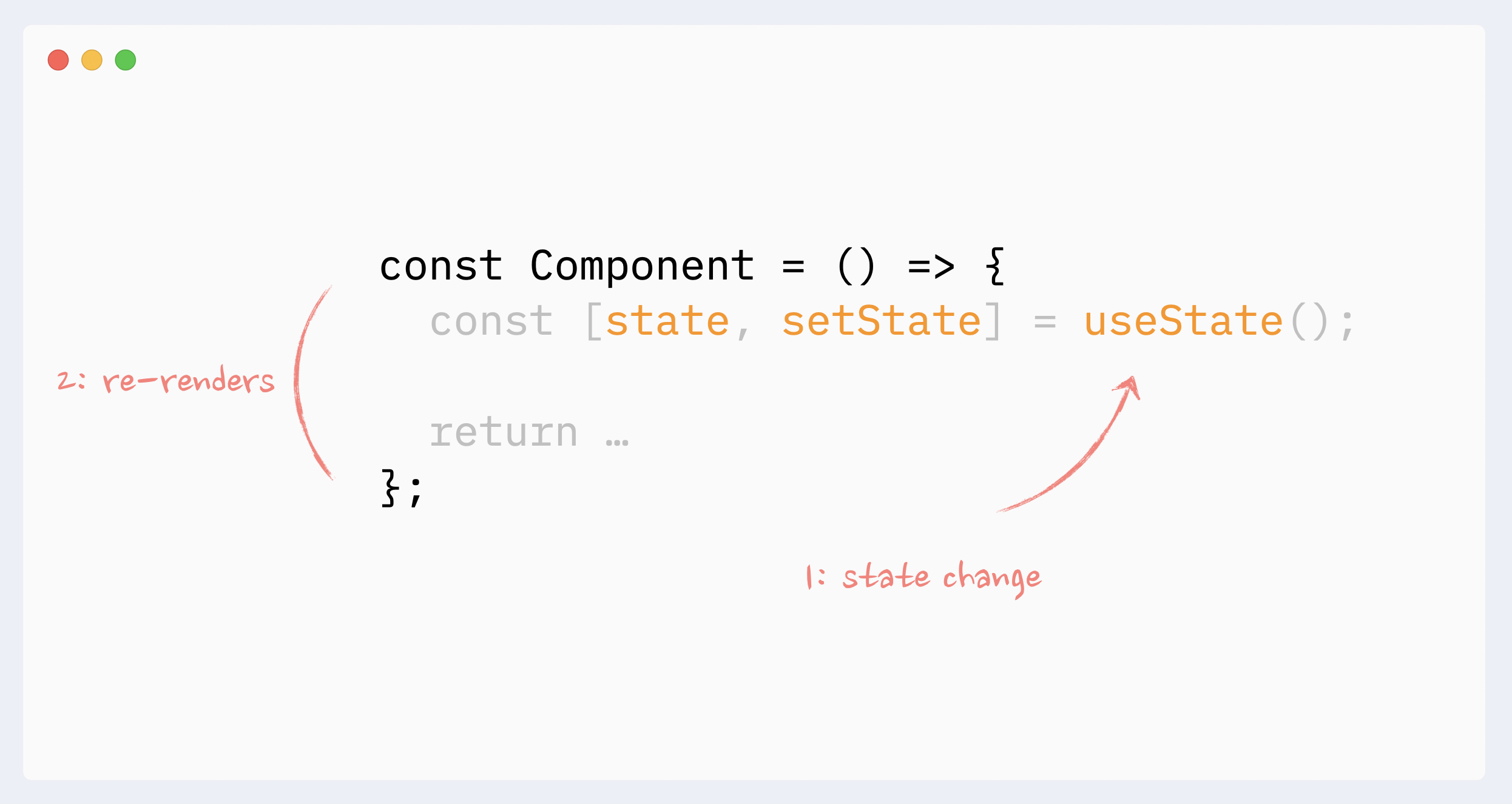 When a component’s state changes, it will re-render itself. Usually, it happens either in a callback or in useEffect hook.