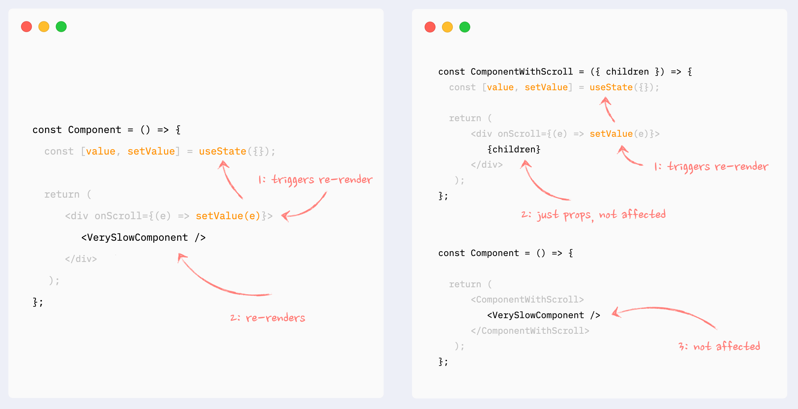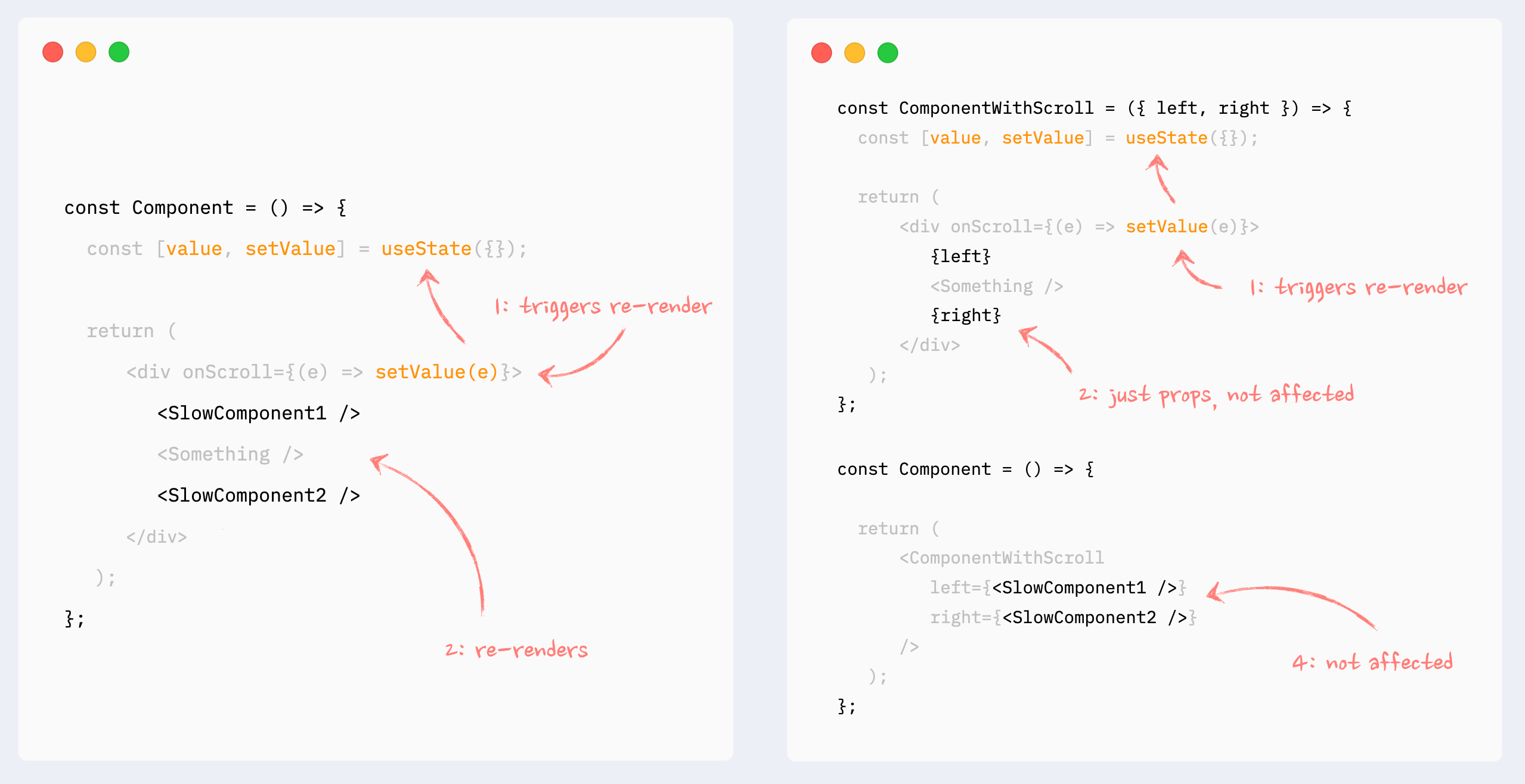 This can also be called “wrap state around children”. This pattern is similar to “moving state down”: it encapsulates state changes in a smaller component. The difference here is that state is used on an element that wraps a slow portion of the render tree, so it can’t be extracted that easily. A typical example would be onScroll or onMouseMove callbacks attached to the root element of a component.