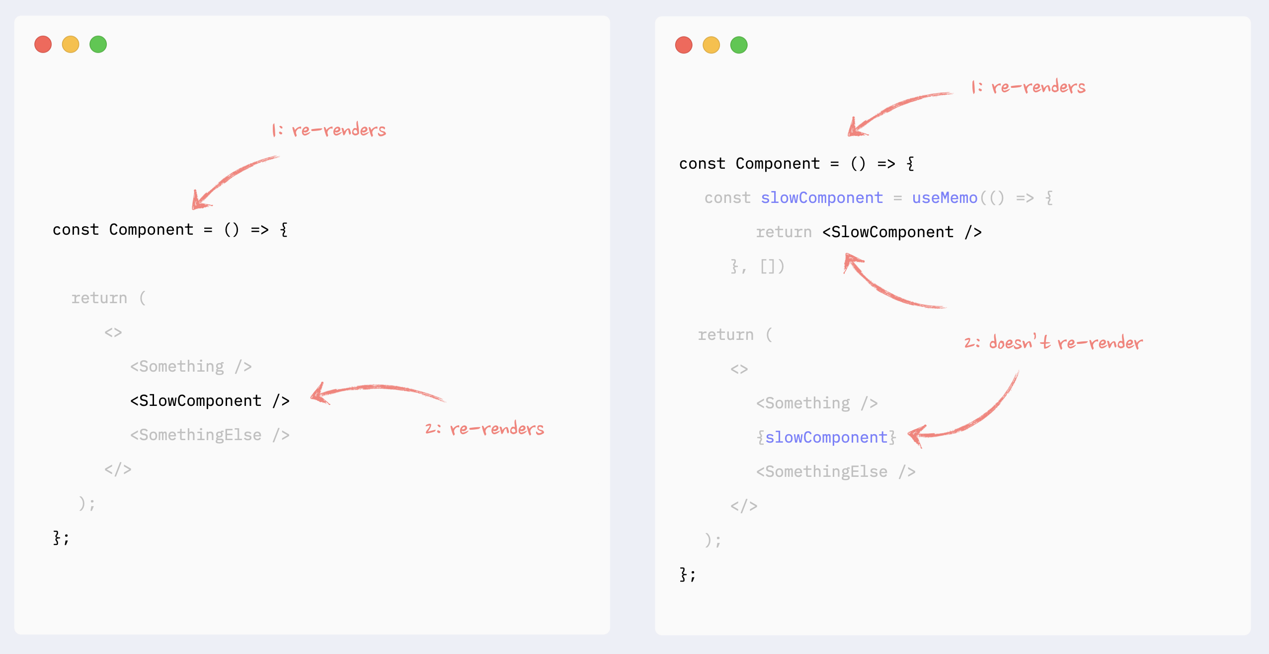 This can be useful when rendering a heavy component that is not dependent on the source of re-renders (i.e. state, changed data).