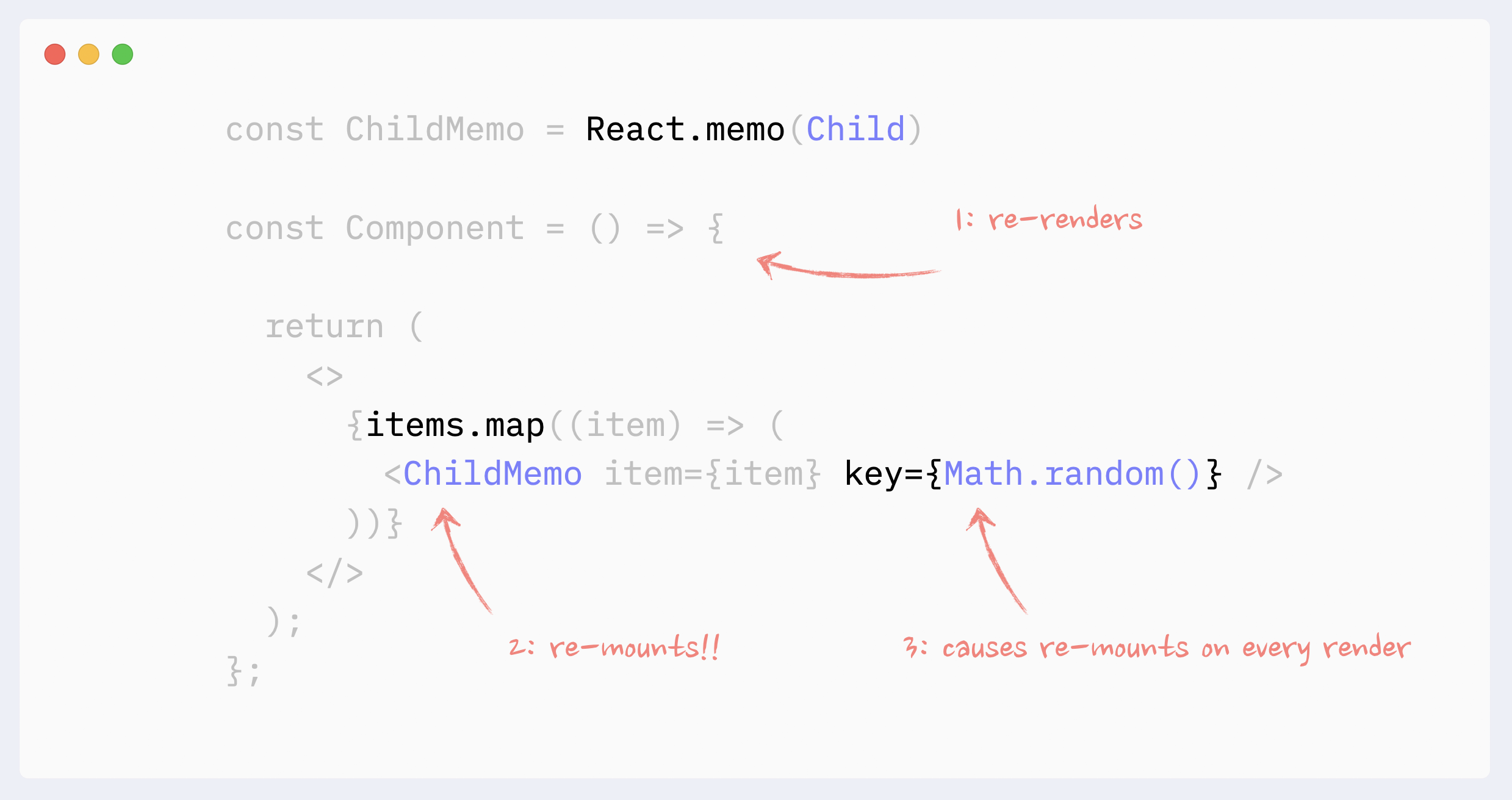 In addition to the regular re-renders rules and patterns, the key attribute can affect the performance of lists in React.