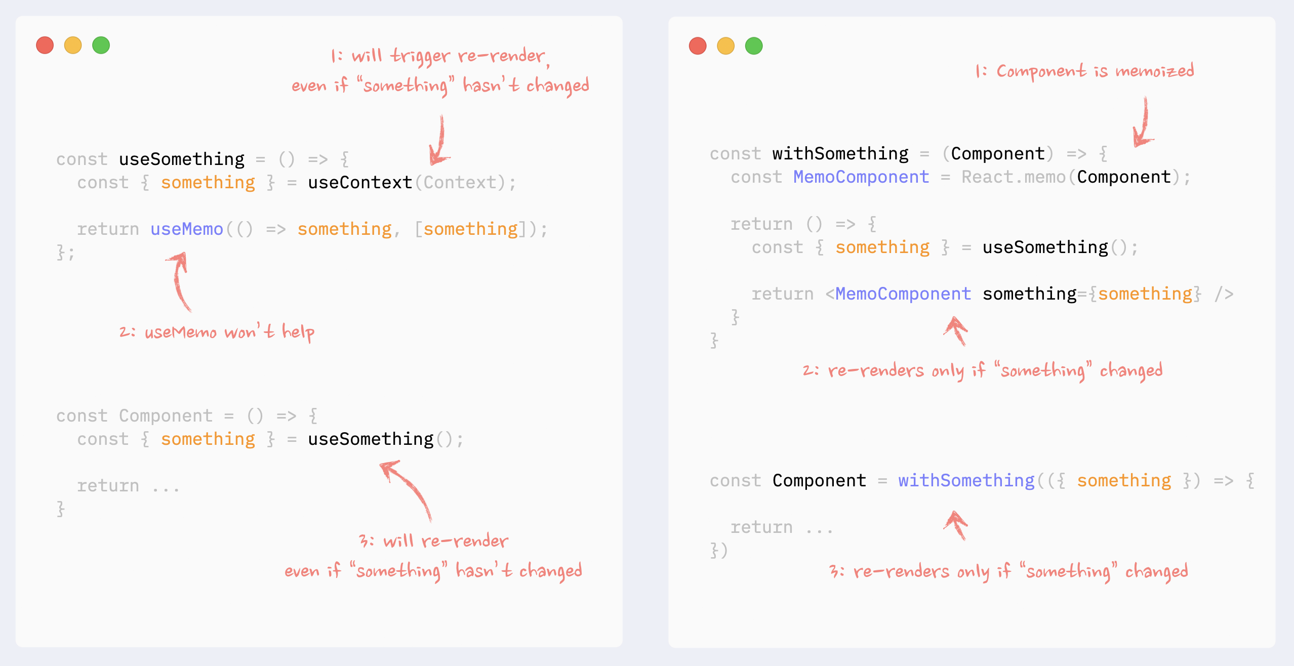- if the hook uses Context and Context’s value changes, it will trigger an unpreventable re-rerender of the “host” component